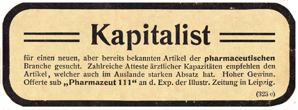 Leider fällt das Publikum trotz aller Bemühungen von Ärzten und Behörden, es über den Schwindel aufzuklären, den die Geheimmittelfabrikanten treiben, noch immer auf die geschickt und in großem Umfang betriebenen Reklamekünste herein, und so darf man sich nicht wundern, zahllose derartige Mittel gegen alle möglichen Krankheiten und Leiden anzutreffen.