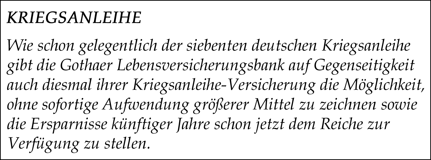 In der angeregten Erörterung sprachen sich einige Herren gegen diese Regelung aus, vertraten vielmehr den Standpunkt, daß das erheblich erhöhte Risiko der Kriegsgefahr von den Kriegsteilnehmern getragen werden müsse. Demgegenüber wurde vom geheimen Regierungsrat Direktor Samwer-Gotha und Direktor Dr. Bischoff-Leipzig aus allgemeinen wirtschaftlichen und praktischen Gründen der von dem Berichterstatter befürwortete allgemeine Entschluß der Kriegsgefahr in die Lebensversicherung unterstützt.