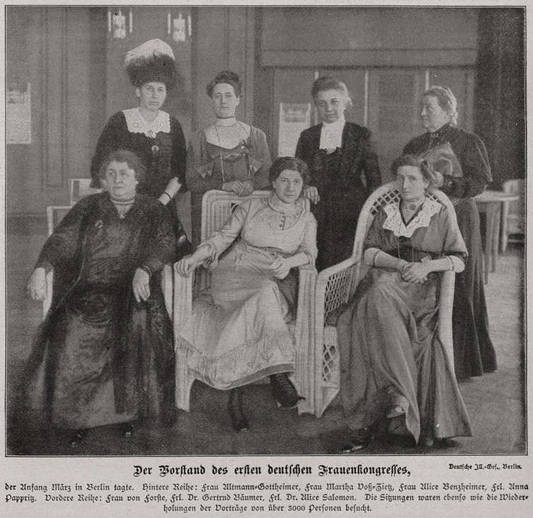Alice Salomon ist die Verfasserin vom zweiten Teil des „Handbuchs der Frauenbewegung“, herausgegeben von Helene Lange und Gertrud Bäumer. Eine Sammlung von Vorträgen, die sie hielt, ist unter dem Titel: „Soziale Frauenpflichten“ erschienen. Alice Salomon gehört dem Vorstand des Bundes Deutscher Frauenvereine als protokollierende Schriftführerin an.