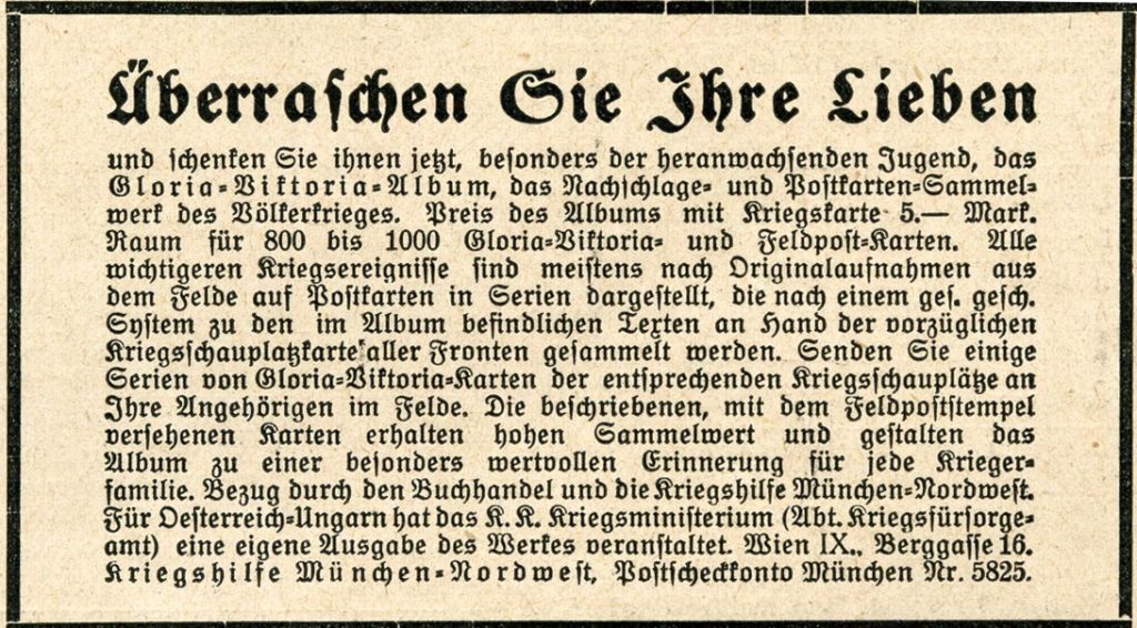 und schenken Sie Ihnen jetzt, besonders der heranwachsenden Jugend, das Gloria-Victoria-Album, das Nachschlage- und Postkarten-Sammelwerk des Völkerkrieges. Preis des Albums mit Kriegskarte: 5.- Mark. Raum für 800 – 1000 Gloria-Victoria und Feldpost-Karten. Alle wichtigen Kriegsereignisse sind meist nach Originalazfnahmen aus dem Felde auf Postkarten in Serien dargestellt, die nach einem gef. gesch. System zu den im Album befindlichen Texten an Hand der vorzüglichen Kriegsschauplatzkarte aller Fronten gesammelt werden. Senden Sie einige Serien von Gloria-Victoria-Karten der entsprechenden Kriegsschauplätze an Ihre Angehörigen im Felde. Die beschriebenen, mit dem Feldpoststempel versehenen Karten erhalten hohen Sammelwert und gestalten das Album zu einer besonders wertvollen Erinnerung für jede Kriegerfamilie. Bezug durch den Buchhandel und die Kriegshilfe München-Nordwest. Für Österreich-Ungarn hat das k.k. Kriegsministerium (Abt. Kriegsfürsorgeamt) eine eigenen Ausgabe des Werkes veranstaltet. Wien IX, Bergasse 16. Kriegshilfe München-Nordwest, Postscheckkonto München N. 5825