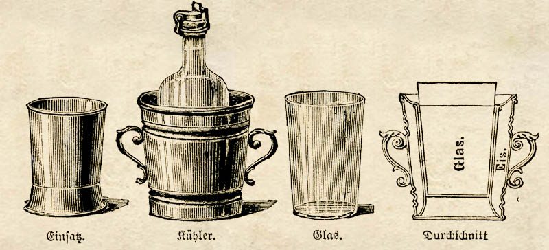 In der gleichen Form und Ausstattung wie man bisher „Weinkühler“ hatte, erhält man jetzt auch solche für Selterwasser, so daß man in der Lage ist, dieses Getränk bei Tische längere Zeit kalt zu erhalten. Der Apparat ist von vernickeltem Metall hergestellt und mit zierlichen kleinen Griffen an beiden Seiten versehen. Es ist zugleich eine Zierde für die Tafel, gleich dem Weinkühler.